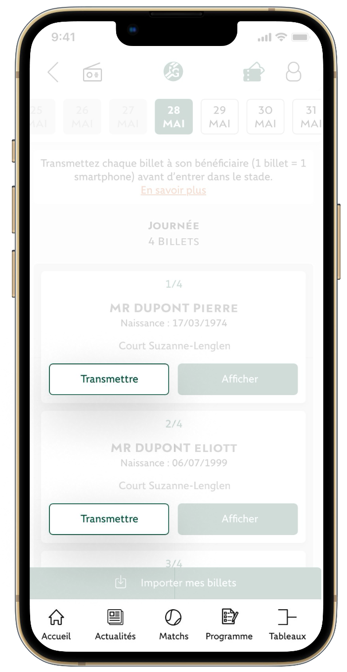 Le QR code et votre numéro de place s’affichent dans l’app. Présentez-les aux contrôles pour accéder au stade et au court indiqué. Bonne session !